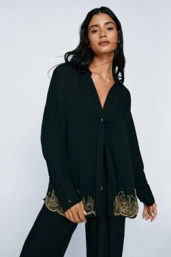 Beach days pending. Feel sunkissed in our oversized cover up shirt, made in high quality crinkle fabric, with a sparkling beaded design, comfortable oversized fit, and button front fastening. Wear it with the matching pants and sandals for a look that can take you seamlessly from the beach to the bar.