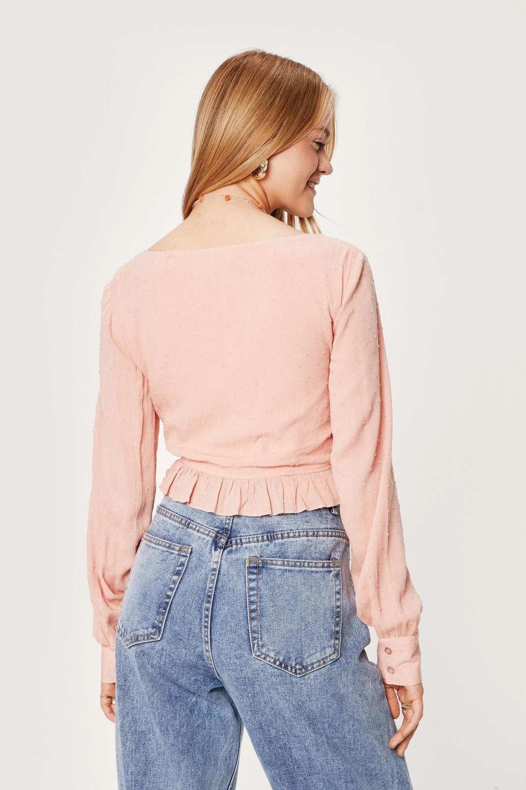 Cup to no good. This top features a cropped silhouette, square neckline, blouson sleeves, cupped design, textured spotty design, and ruffled detailing at neckline. For your next social thing, style with split hem jeans, faux leather stiletto heels, and a hella cute shoulder bag.
