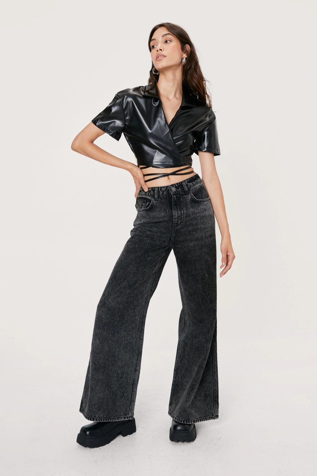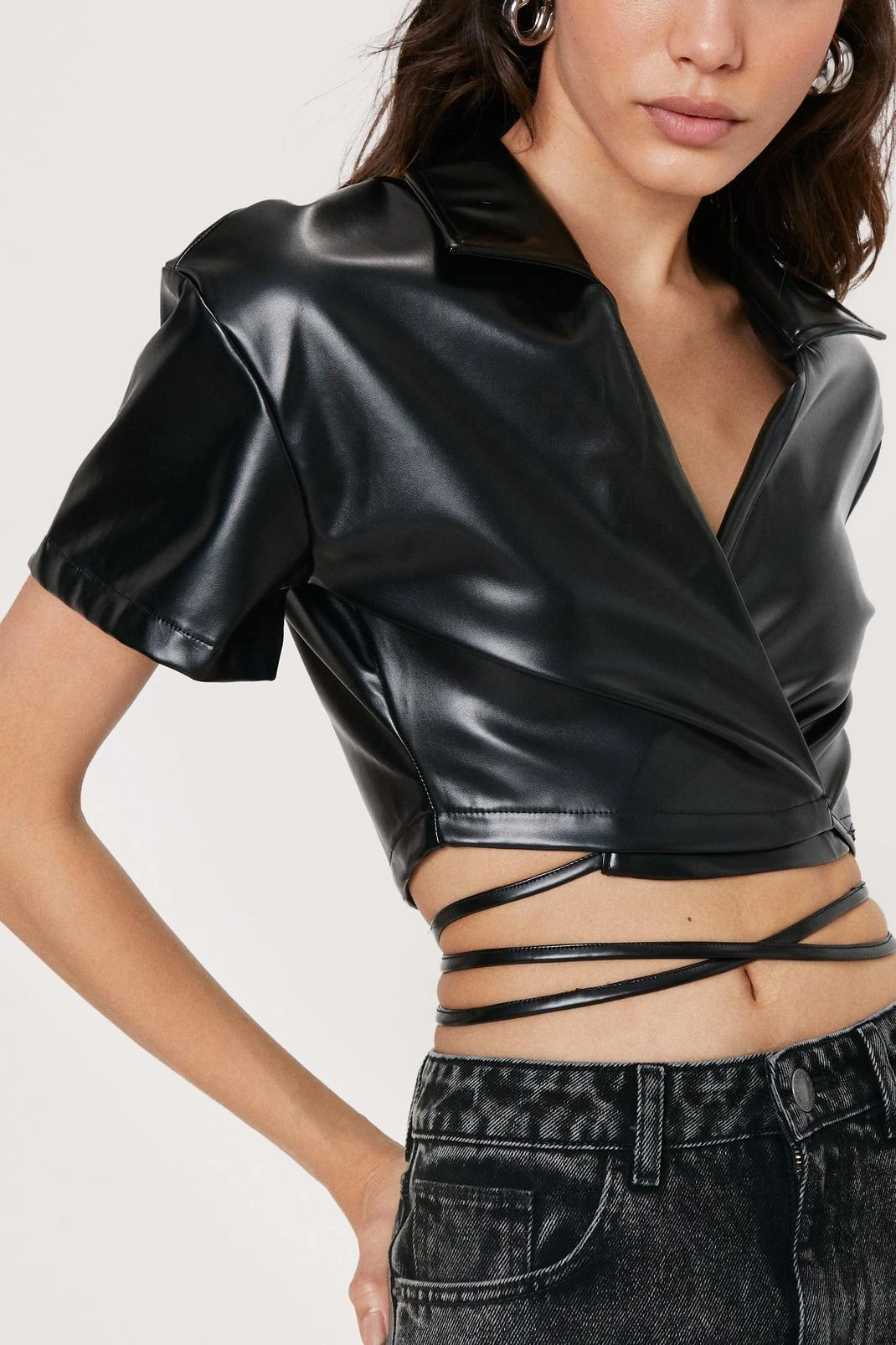 - Style: Faux Leather Wrap Wide Sleeve Crop Top