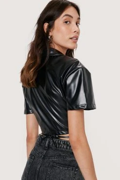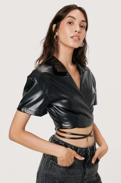 Faux leather; a closet staple since forever. This crop top comes in faux leather and feature a V neckline, relaxed, cropped silhouette, short sleeves, wrap design, strappy design, bow tie closure. Great for styling with your favorite jeans.