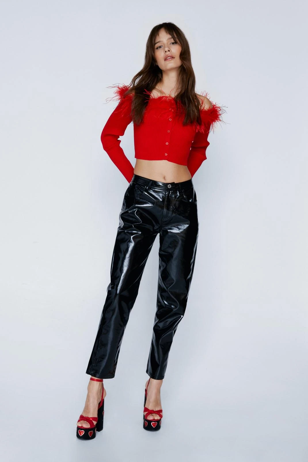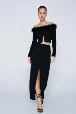Top priority. Feel confident in our bardot top, with a fun and flirty feather trim, comfortable knit fabric, and a flattering bardot neckline. Pairs well with a leather pants or jeans for an instant occasion look that will turn heads, whether you’re hitting up happy hour or your nearst dancefloor.