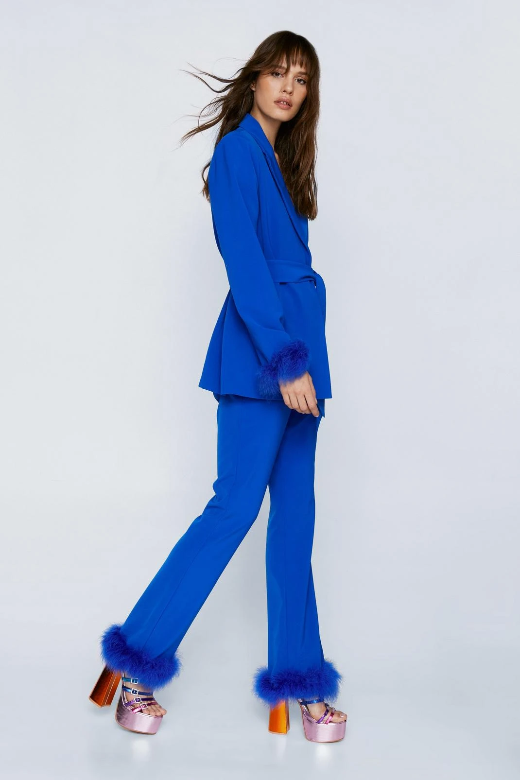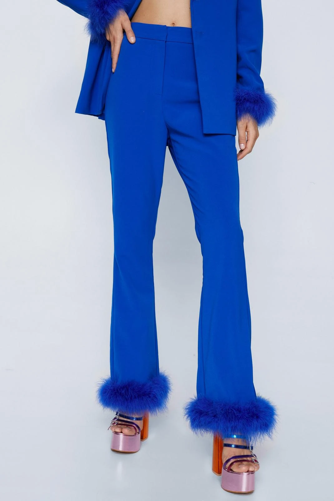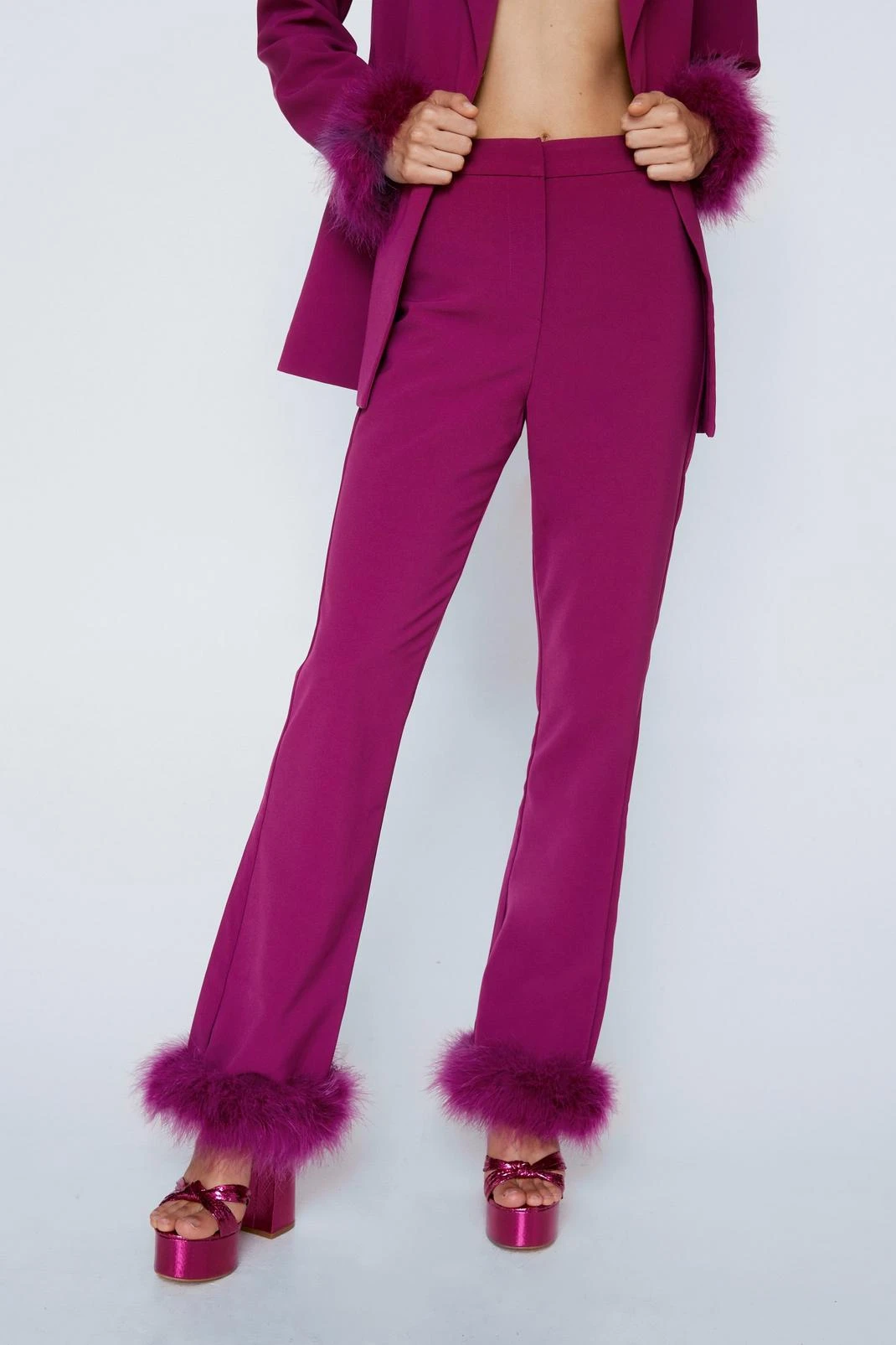 Ruffle some feathers. Our flared pants will have you feeling flirty yet formal with their added feather trims. Style them with the coordinating blazer and strappy heels for party season and beyond.