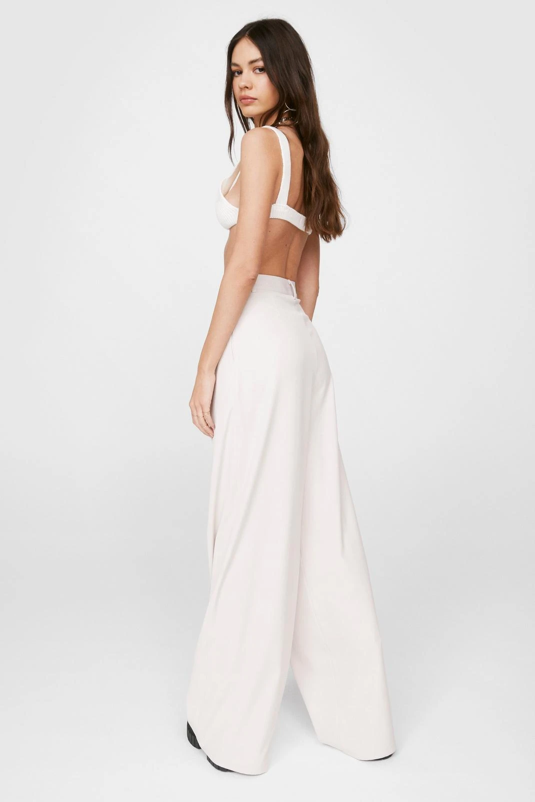 Pants for bossin’ your to-do list in. These pants feature a high waisted, wide leg silhouette, zip fly closure, belt loops, pockets at sides, and dart detailing at front. Model is 5’9′ and wears a US size 6/UK size 10.