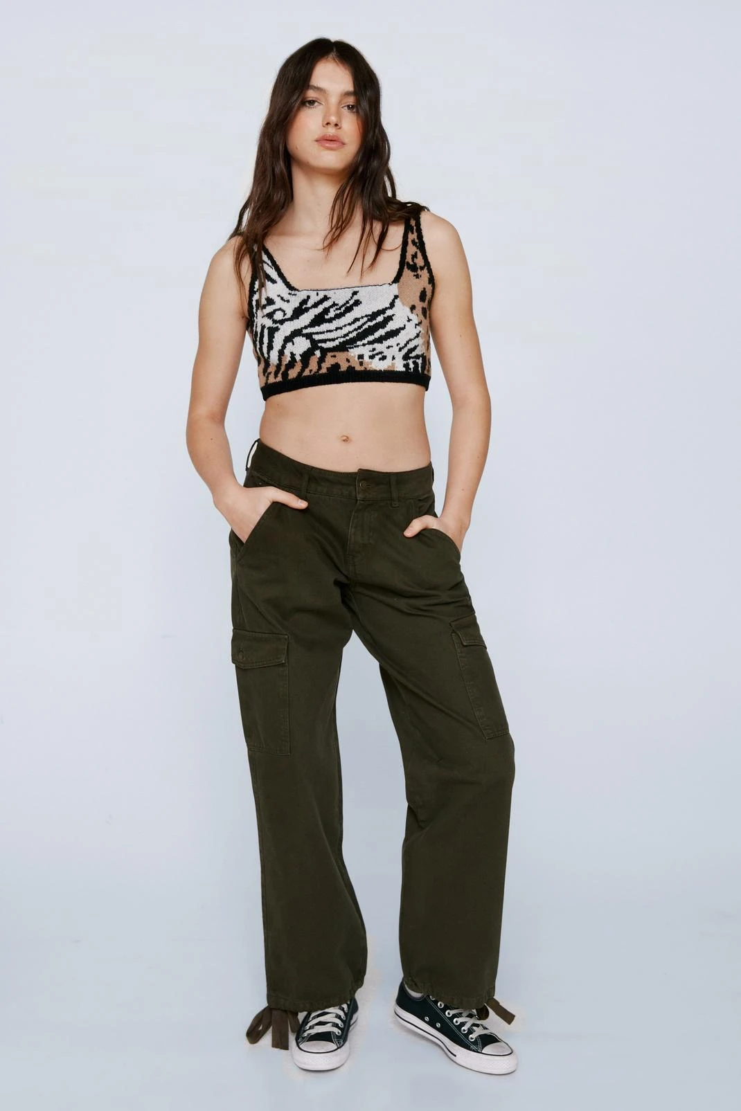 Hear her roar. Style our leopard print knitted bralette with cargo pants and sneakers.