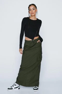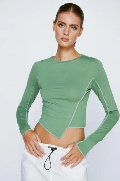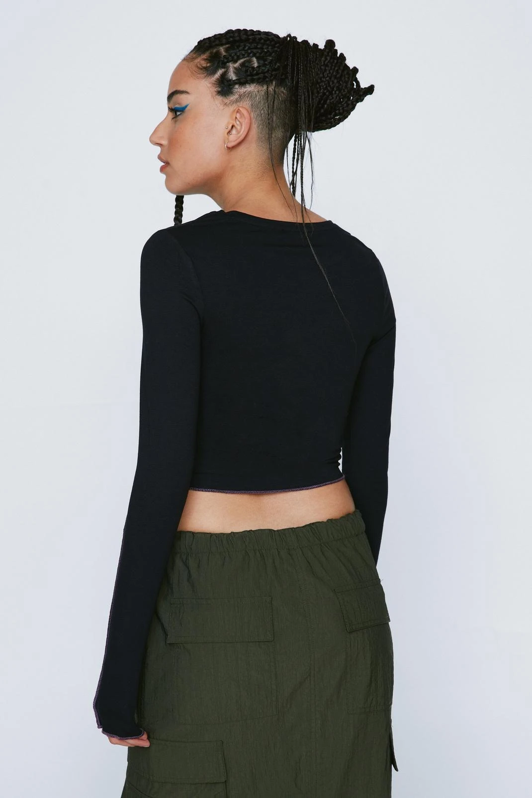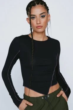Top priority. Feel cute in our long sleeve top, with a unique wrap design, contrasting seam detailing, and a flattering bodycon fit. Style with a high waisted skirt or cargo pants for an elevated daytime look, perfect for office days and casual days out with the gals.