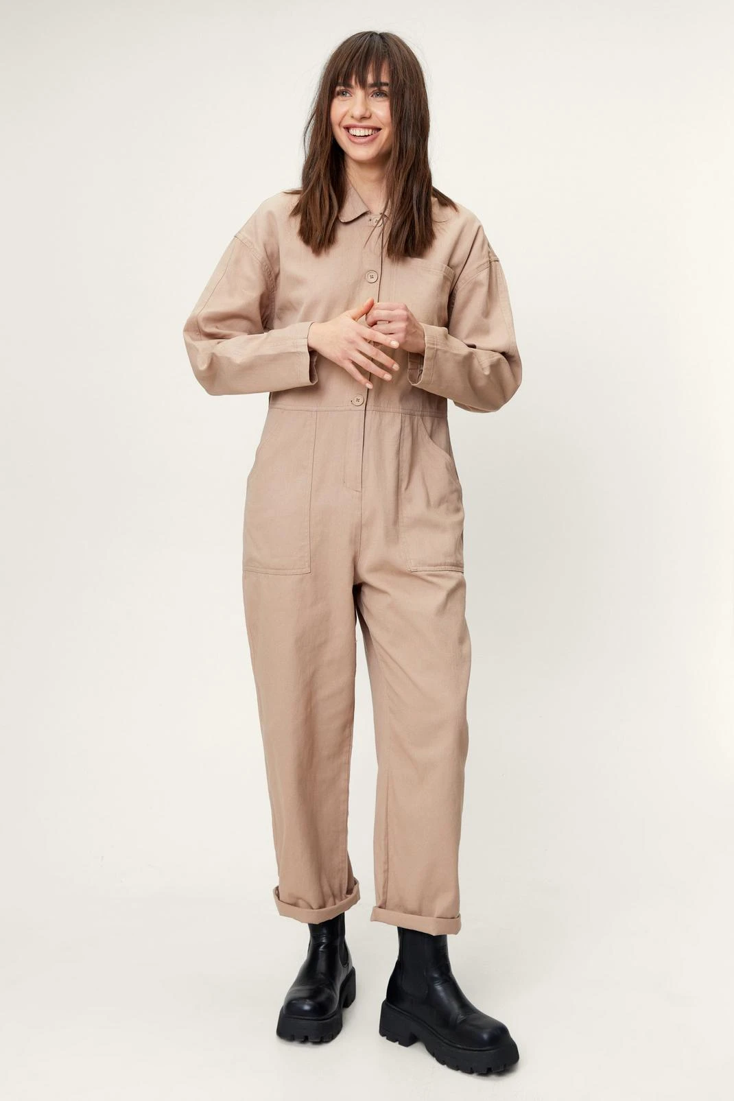 Fusing fashion with practicality is this ankle-grazing boilersuit. It comes in 100% breathable cotton and features a loose silhouette, pointed collared neckline, button down closures throughout front, deep pocket at bust, long sleeves, and straight leg design. Cinch the waistline on yours by wrapping around a jersey sweatshirt. Wear effortlessly with biker boots.