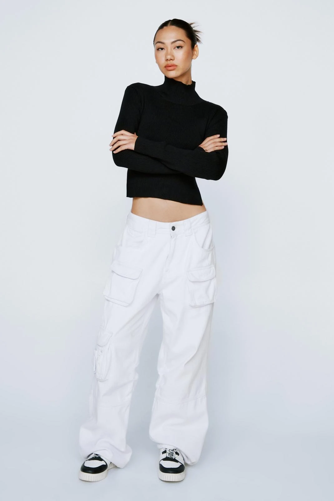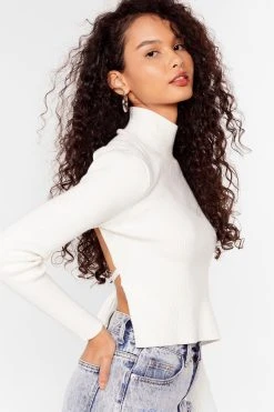 We knew you wouldn’t be away for long xoxo. This top comes in a ribbed knit and features a turtleneck, fitted, cropped silhouette, and open back with tie closure. Style with high waisted jeans and faux leather, stiletto mules. Model is 5’9″ and wears a US size 6/UK size 10.