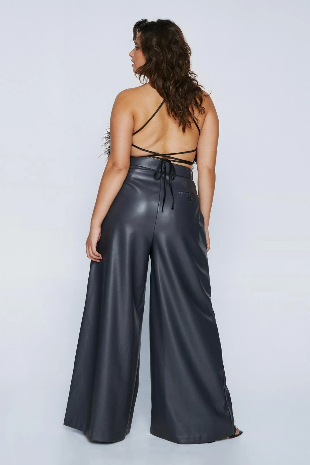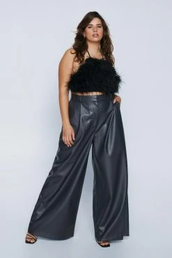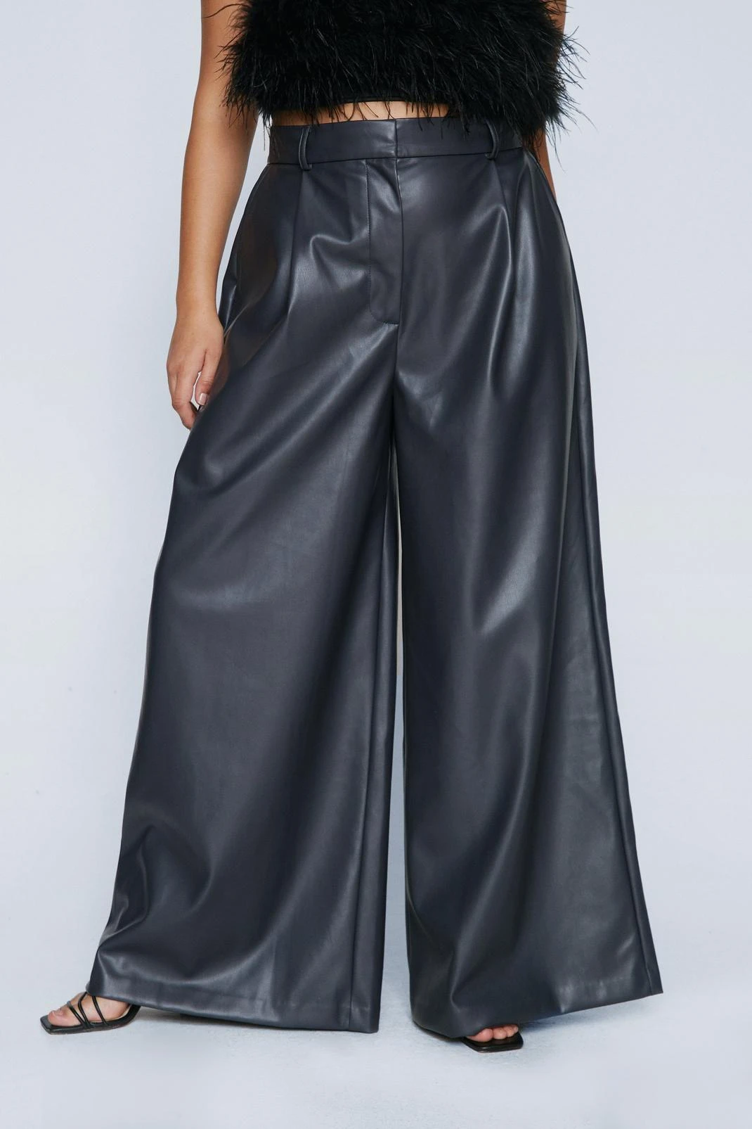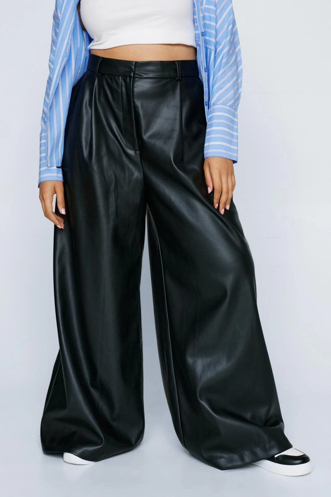 Pleasing in pleather. Our plus size faux leather wide leg pants will have you feeling confident when you step out. Pairs perfectly with a textured crop top and karaoke machines.