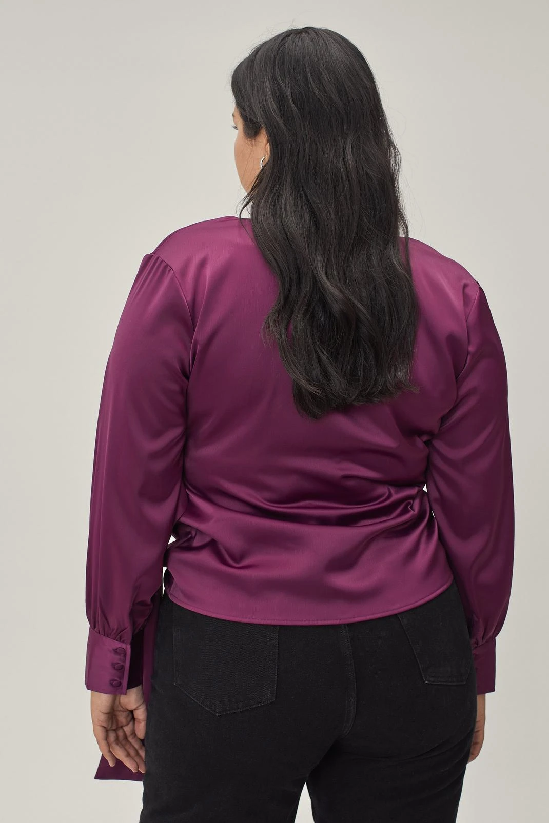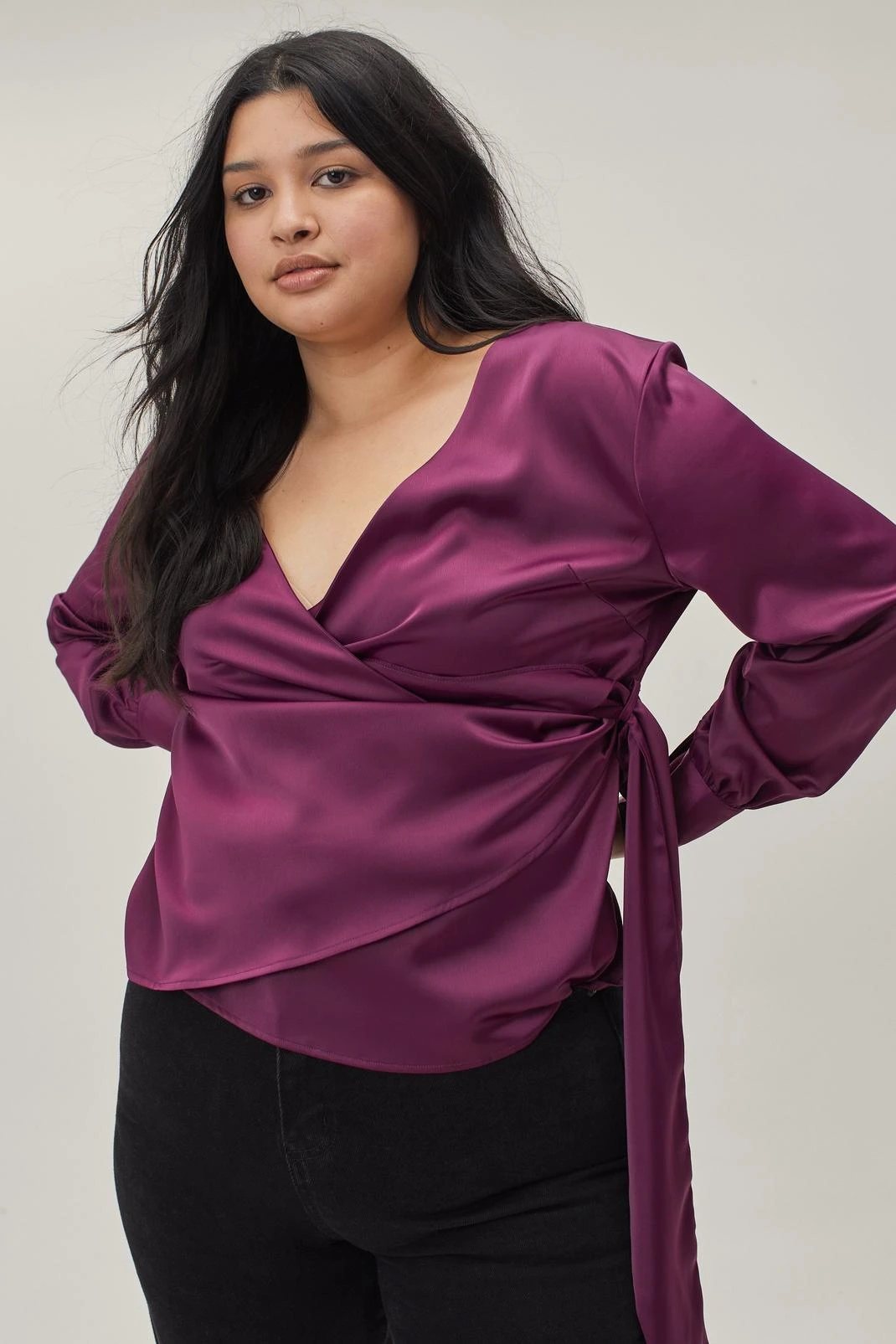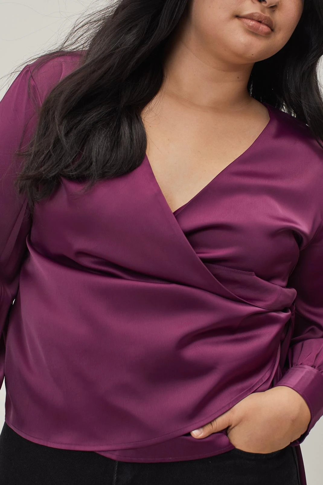 Satin siren. This plus size blouse comes in a soft satin that drapes across the bodice. It features a plunging V neckline, wrap front with oversized bow tie finish, long sleeves, and fitted cuffs. A versatile favorite to wear to art events with smart denim jeans and oversized faux fur coats.