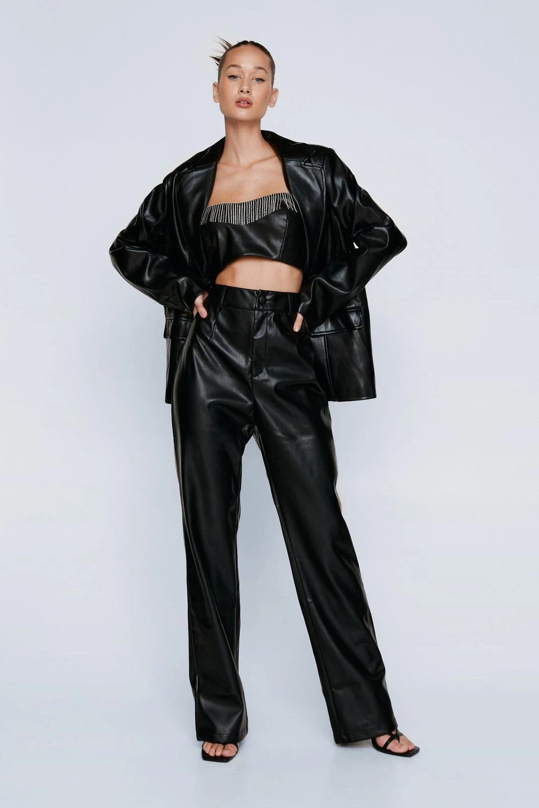 Leather weather. Style our faux leather pants with the coordinating blazer for a matching moment.