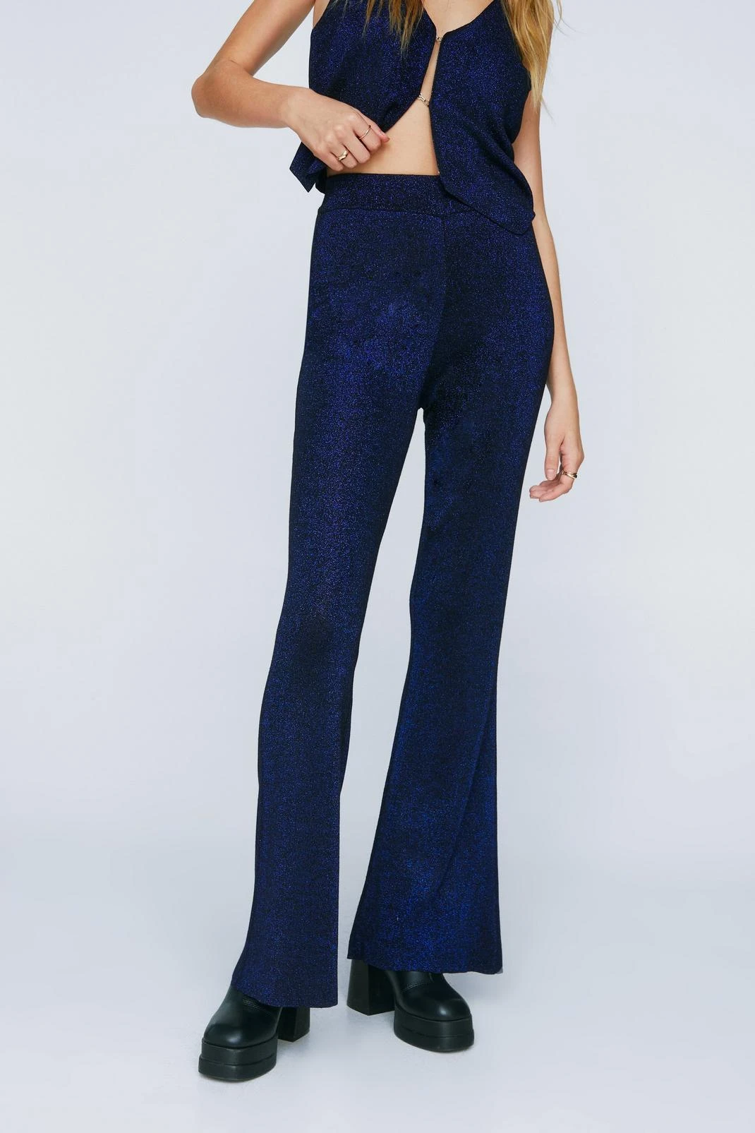 Metallic dreams. Our metallic knitted flare pants pair well with the coordinating vest for a matching moment.