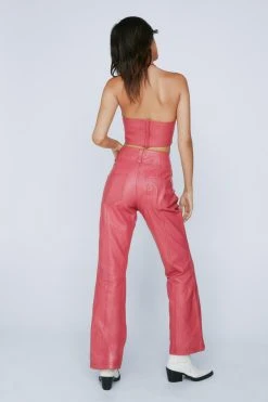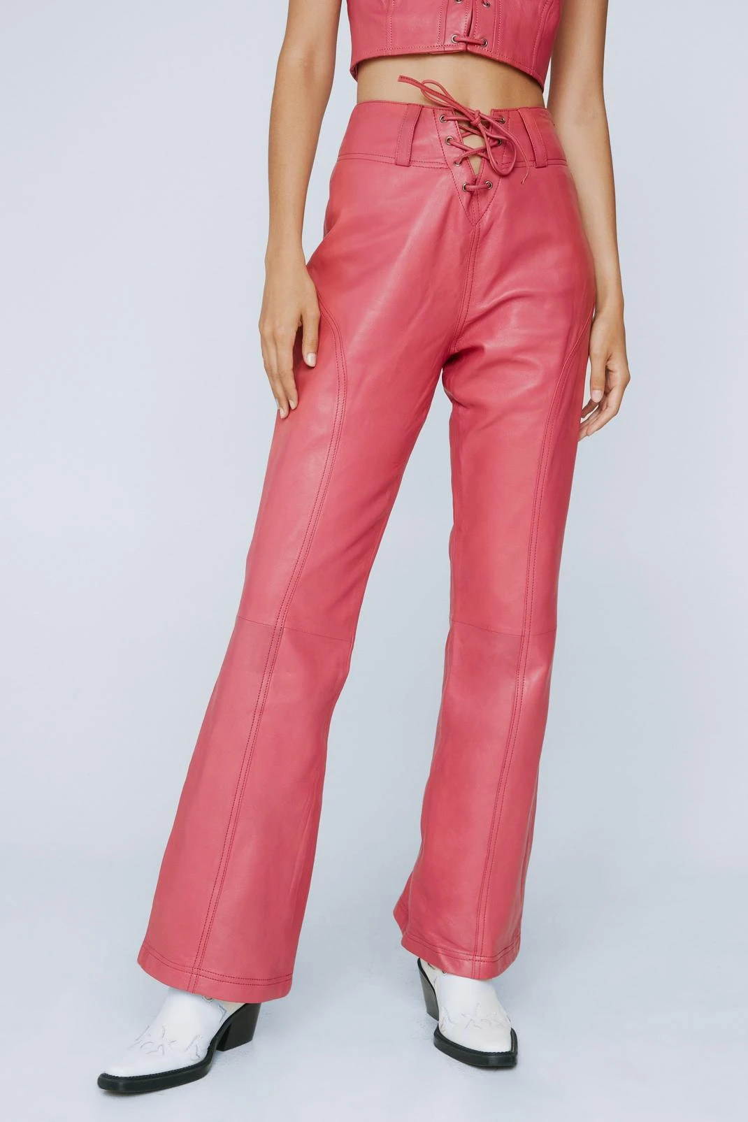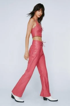 Leg day. Feel confident in our leather pants, made in high quality leather, with an ultra flattering flare design, comfortable high waistline, and a head turning lace up feature. Pairs well with the co-ordinating crop top for a matching moment, perfect for hitting happy hour and nearby dancefloors.