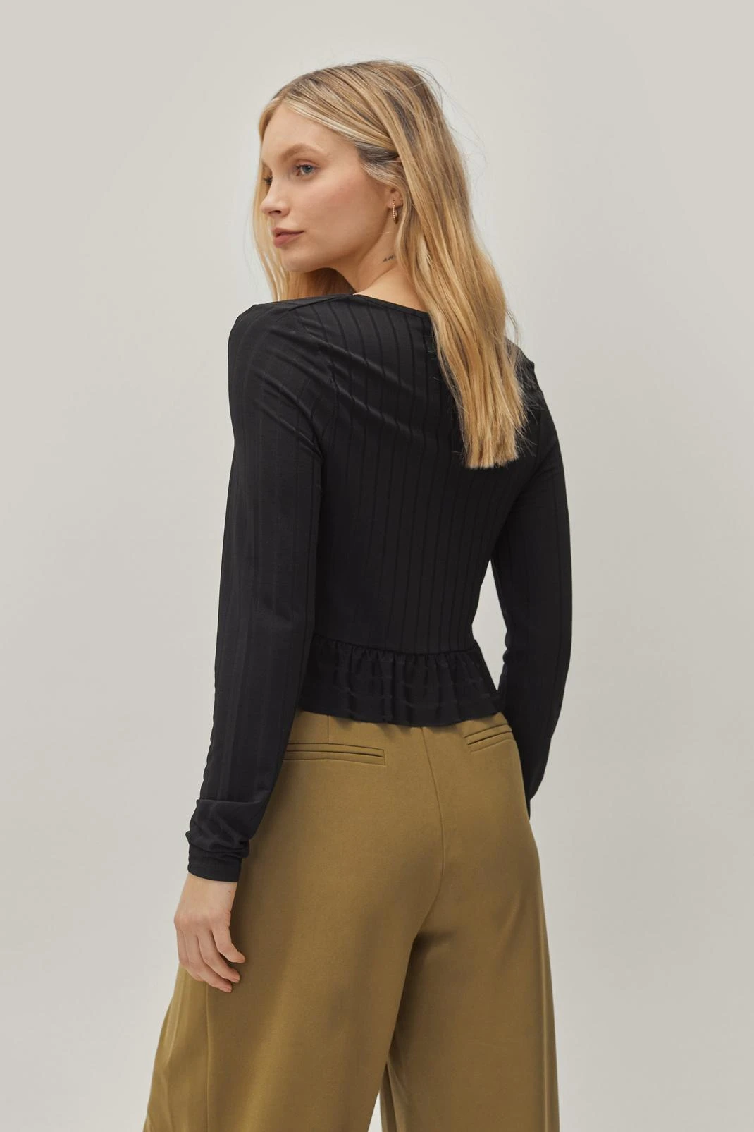 Ruffle and ready. This crop top comes in soft, breathable fabric and features a comfortable relaxed silhouette, a cropped cut that falls just above the waist, long sleeves, a wide scoop neckline that shows off your décolletage, and ruffle hem detail. Pair with wide leg jeans and heeled boots.