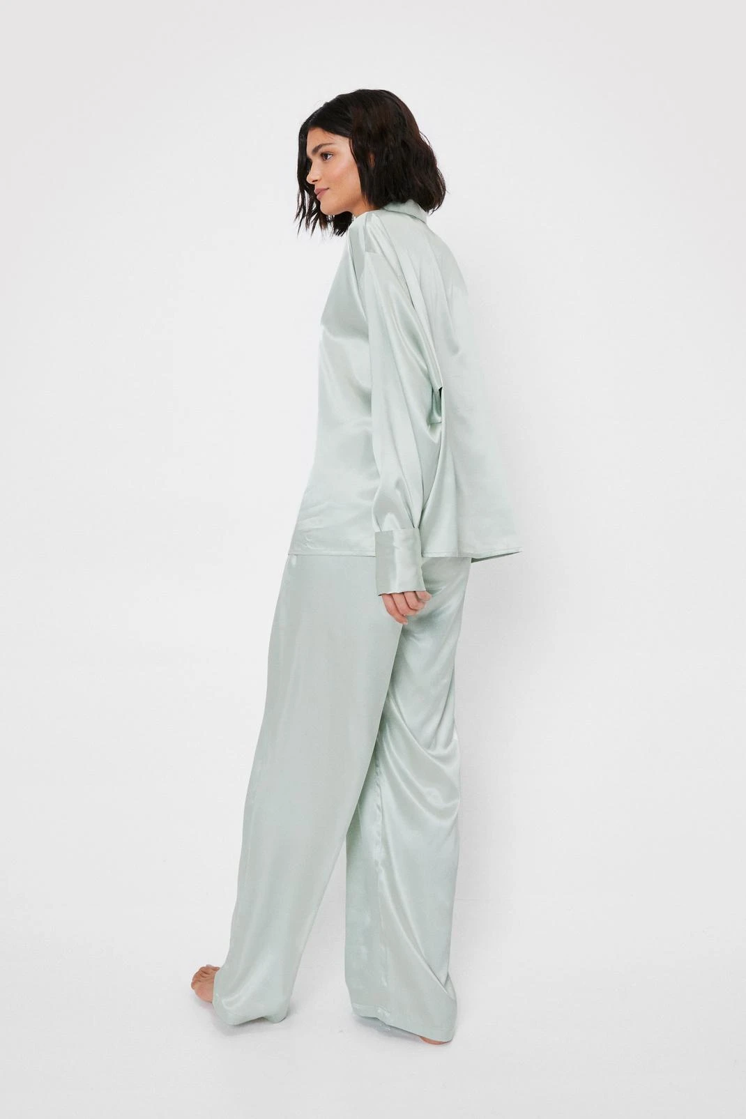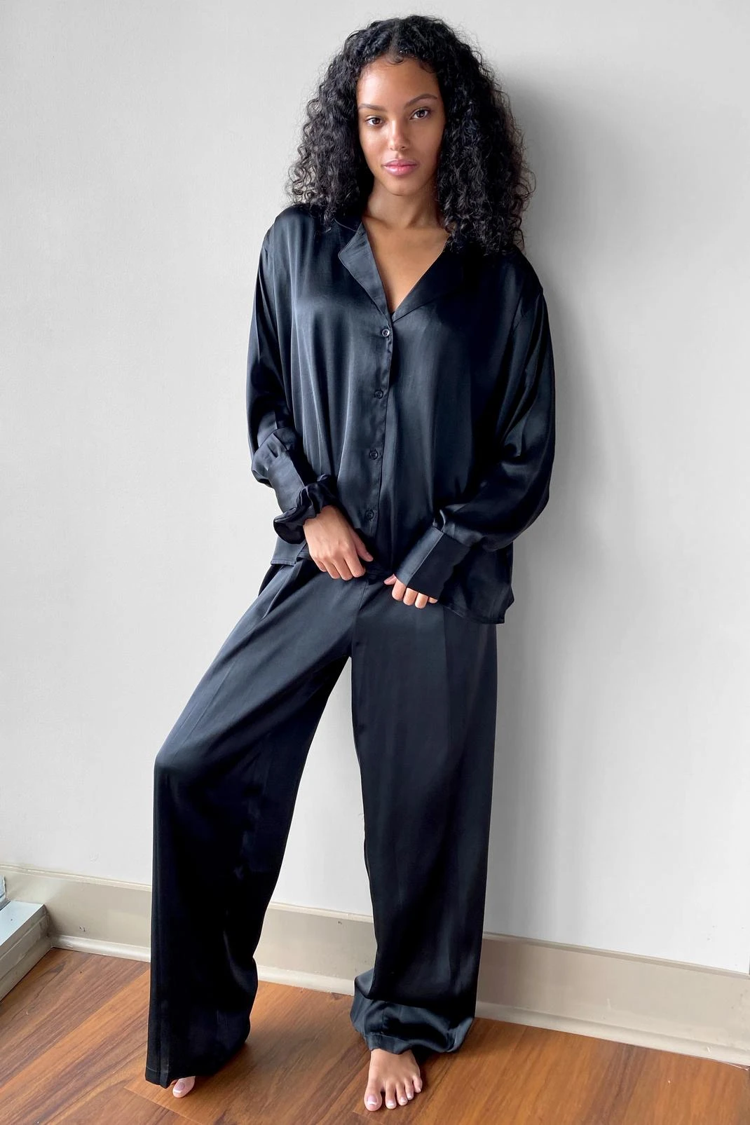 I have a dream… (You know how it goes). The pajama shirt comes in satin and features an oversized silhouette, V neckline, notched lapels, button down closure, and drop, blouson sleeves with fitted cuffs and ruffle detailing. The matching pants feature a high-waisted, relaxed silhouette, and elasticized waist. The matching scrunchie comes in satin and features an elasticized band. Pairs well with a sleek satin eyemask and 8 hours sleep.
