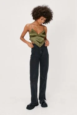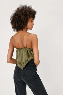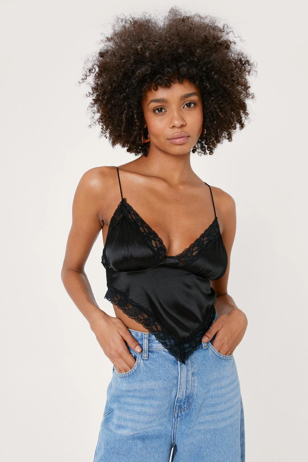 Truly, madly, deeply. This top comes in satin and features a relaxed, cropped silhouette, uneven hem, plunging V-neckline, cupped design, lace trim throughout, and spaghetti straps. Model is 5’8″ and wears a US size 6/UK size 10.