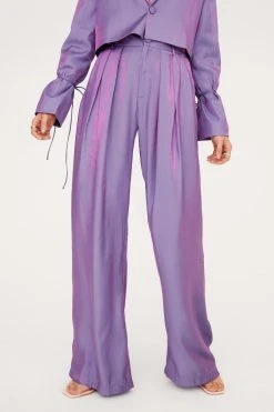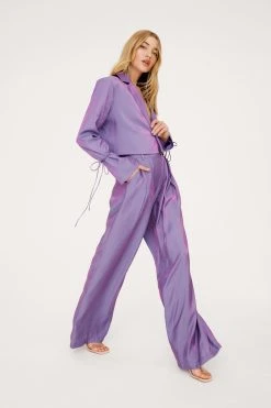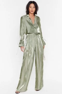 Let us entertain you…These pants come in satin and feature a high waisted, wide leg silhouette, zip fly closure, pleat detailing, belt loops, and shimmer finish throughout. Team with the matching blazer, strappy heels, and your best dance moves. Item sold separate. Model is 5’9″ and wears a US size 6/UK size 10.