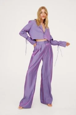 Let us entertain you…These pants come in satin and feature a high waisted, wide leg silhouette, zip fly closure, pleat detailing, belt loops, and shimmer finish throughout. Team with the matching blazer, strappy heels, and your best dance moves. Item sold separate. Model is 5’9″ and wears a US size 6/UK size 10.
