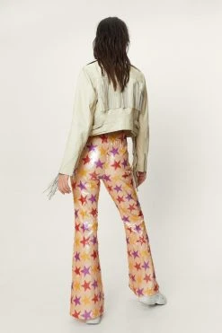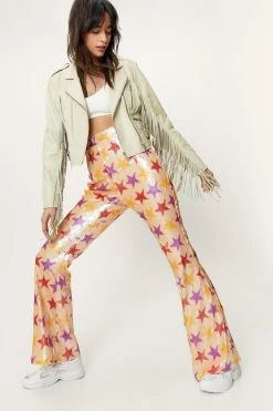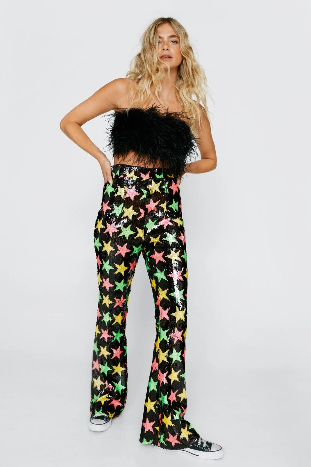 Stars in our eyes. These statement sequin pants feature a super high-waisted design, flattering fit and flare silhouette, technicolor star print, and heavy sequin detailing throughout. Loud and proud, these pants encapsulate the excitement of festival season and are worn best with fringe finishes, suede jackets, and chunky sneakers or sandals.