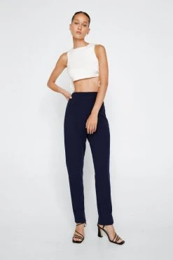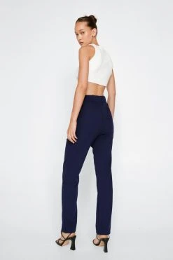Tailored moments. Style with a feathery bandeau top, and square toe mule heels.