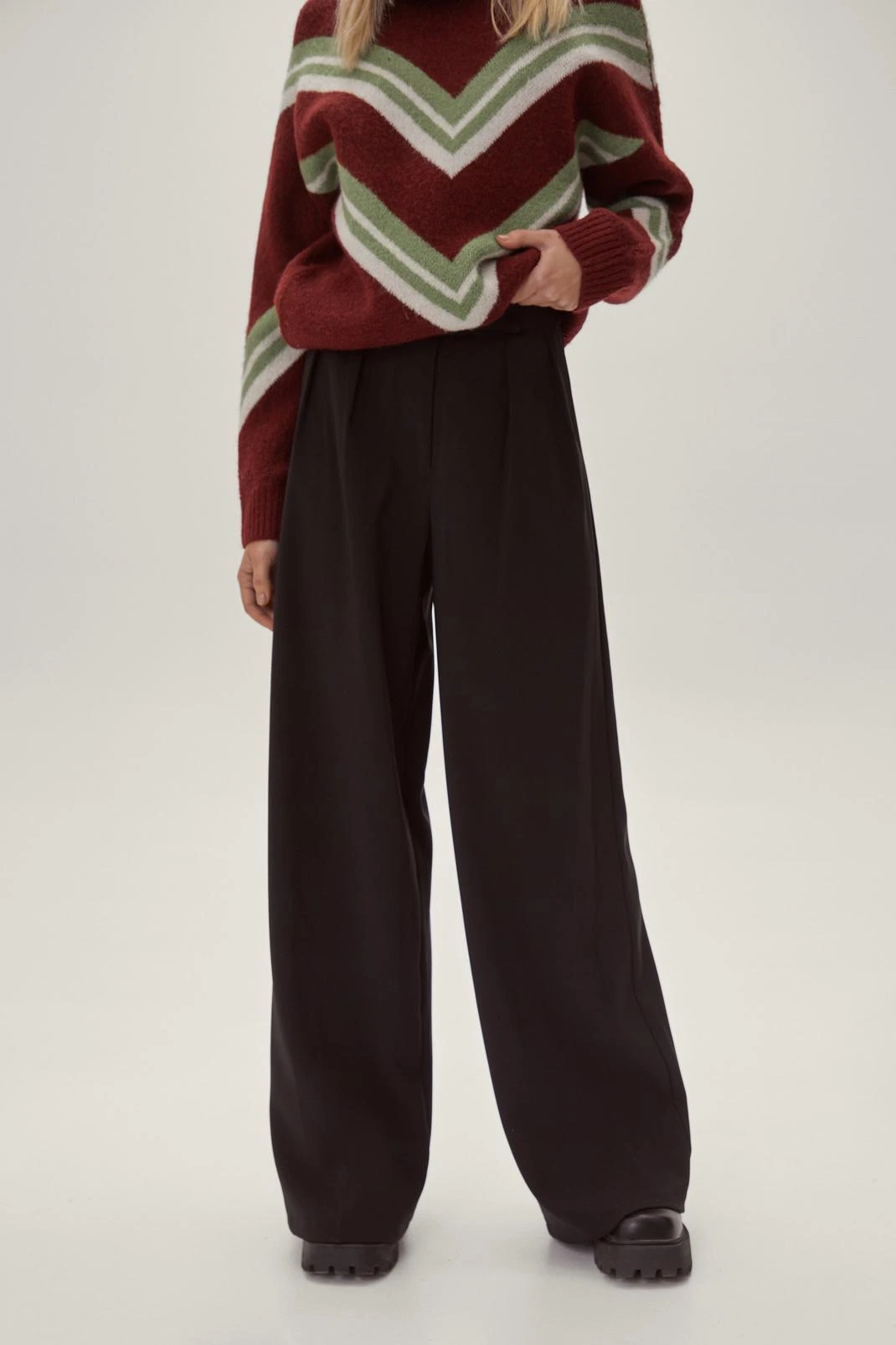 Party pants. These pants come in luxurious, thick twill fabric and feature a wide-leg design that drapes straight down from the hips to the ankle, a high-waisted silhouette that sits just above the hips, hidden zip-front closure, and tailored pleated detail throughout. Pair yours with a simple t-shirt.