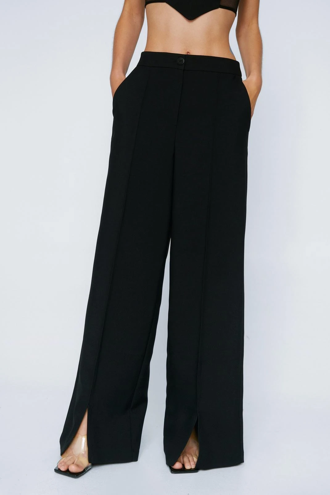 Tailor-made. Feel formal when you step out in our tailored wide leg pants, with unique split front designs and a comfortable high waist. Pairs well with a blazer and late night plans.