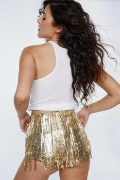 Bead it. Feel fierce in our sequin shorts, made in shimmering sequin fabric, with beaded tassel details. The high waistline ensures your comfort and an ultra flattering fit, while the micro length and bodycon fit will turn heads. Pairs well with the matching sequin cropped blazer, or with a crop top for a more pared down approach. Perfect for discoball dancefloors, festival weekends, and rave nights.