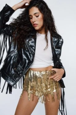 Bead it. Feel fierce in our sequin shorts, made in shimmering sequin fabric, with beaded tassel details. The high waistline ensures your comfort and an ultra flattering fit, while the micro length and bodycon fit will turn heads. Pairs well with the matching sequin cropped blazer, or with a crop top for a more pared down approach.