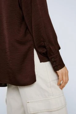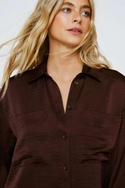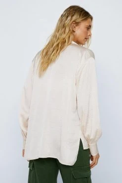 Top priority. Feel fancy in our button up shirt, made in high quality satin fabric, with a comfortable relaxed fit and unique textured detailing. Pair with jeans, cargo pants, or leather pants for a look that will take you anywhere, from office days to date nights.