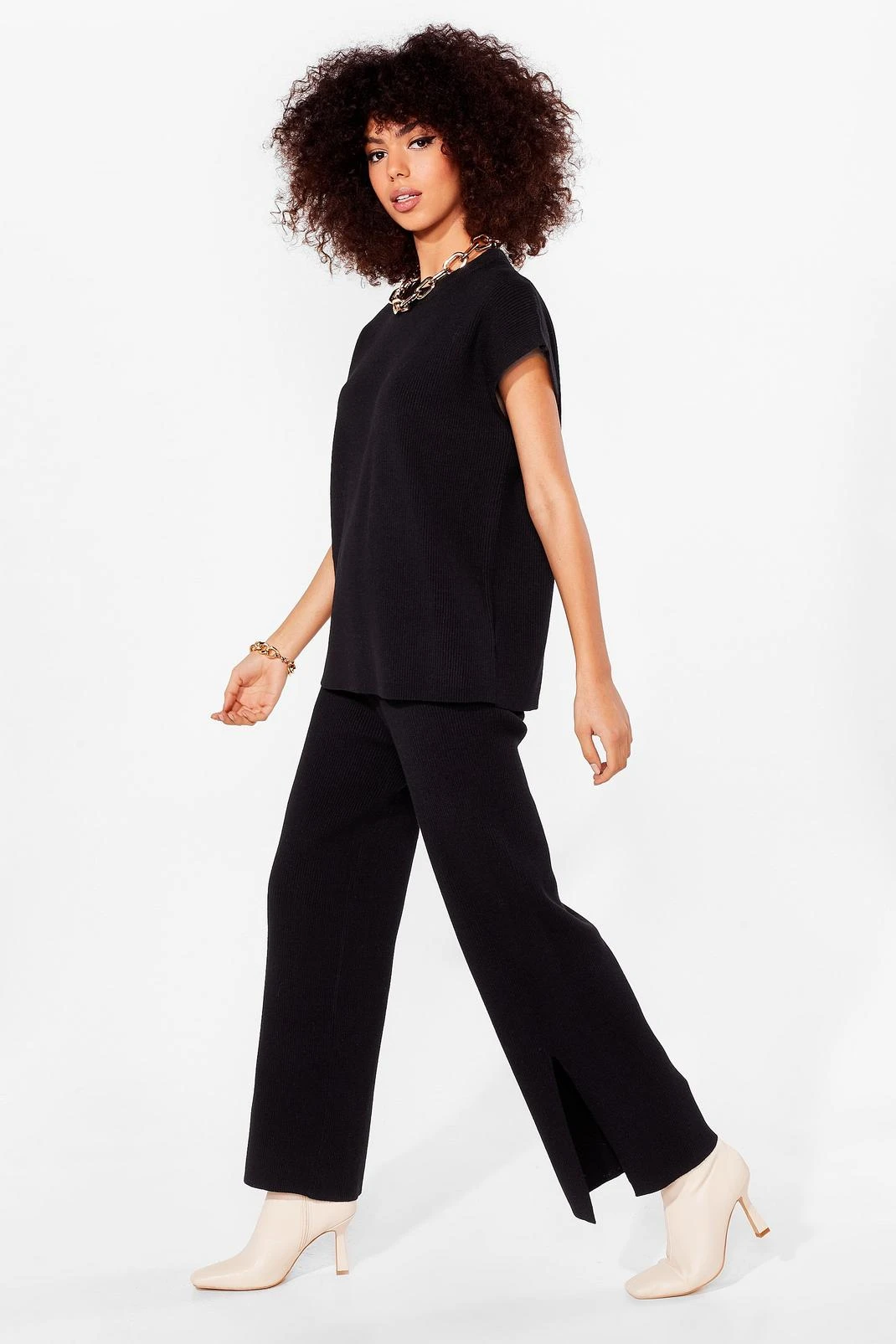 You and me. This top comes in knit and features a crew neckline, relaxed silhouette, and padded shoulders. These pants feature a high-waisted, wide-leg, cropped silhouette, slits at ankles, and elasticized waist.